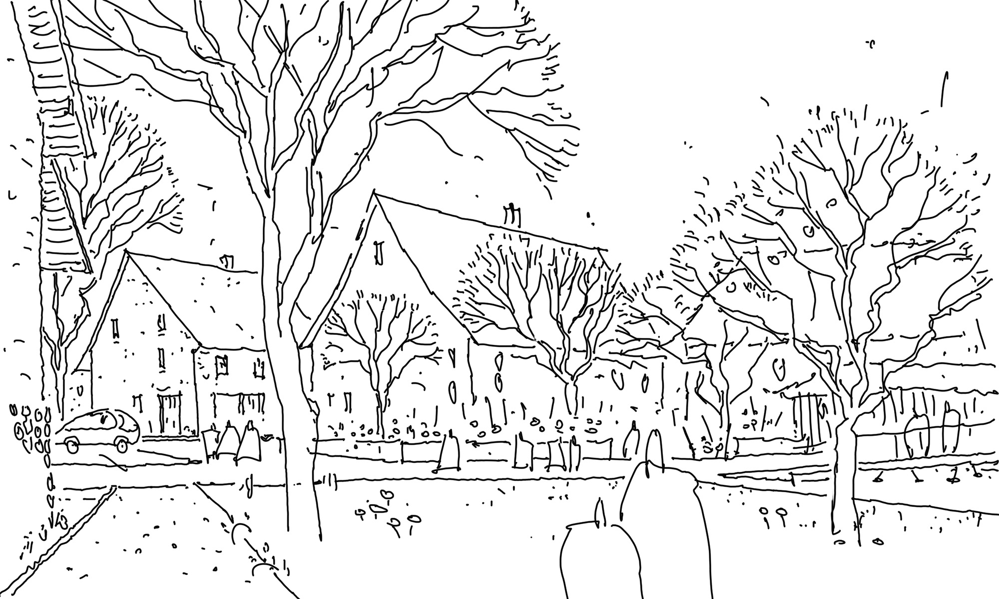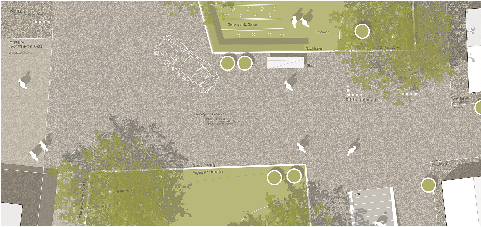 Donaukies bildet einen einheitlichen Stadtboden, über dem sich Gebäude locker verteilen, während ein changierender Gred-Spiegel den Übergang vom Öffentlichen ins Halbprivate markiert. Ein Sprawl aus Solitärbäumen durchzieht das Areal, Fassaden tragen Spaliere aus Birnen, Wein und Clematis, ergänzt durch Flächen für gemeinschaftliches Gärtnern und Spiel. Regenwasser wird in Senken gesammelt, Zisternen zugeführt und zur Bewässerung genutzt. Ein multifunktionaler Gartenplatz nimmt Parken, Feste und Veranstaltungen auf. Eine neue barrierefreie Brücke rahmt den Blick zur Donau, ein Rundweg erschließt sonnige Aufenthaltsorte.