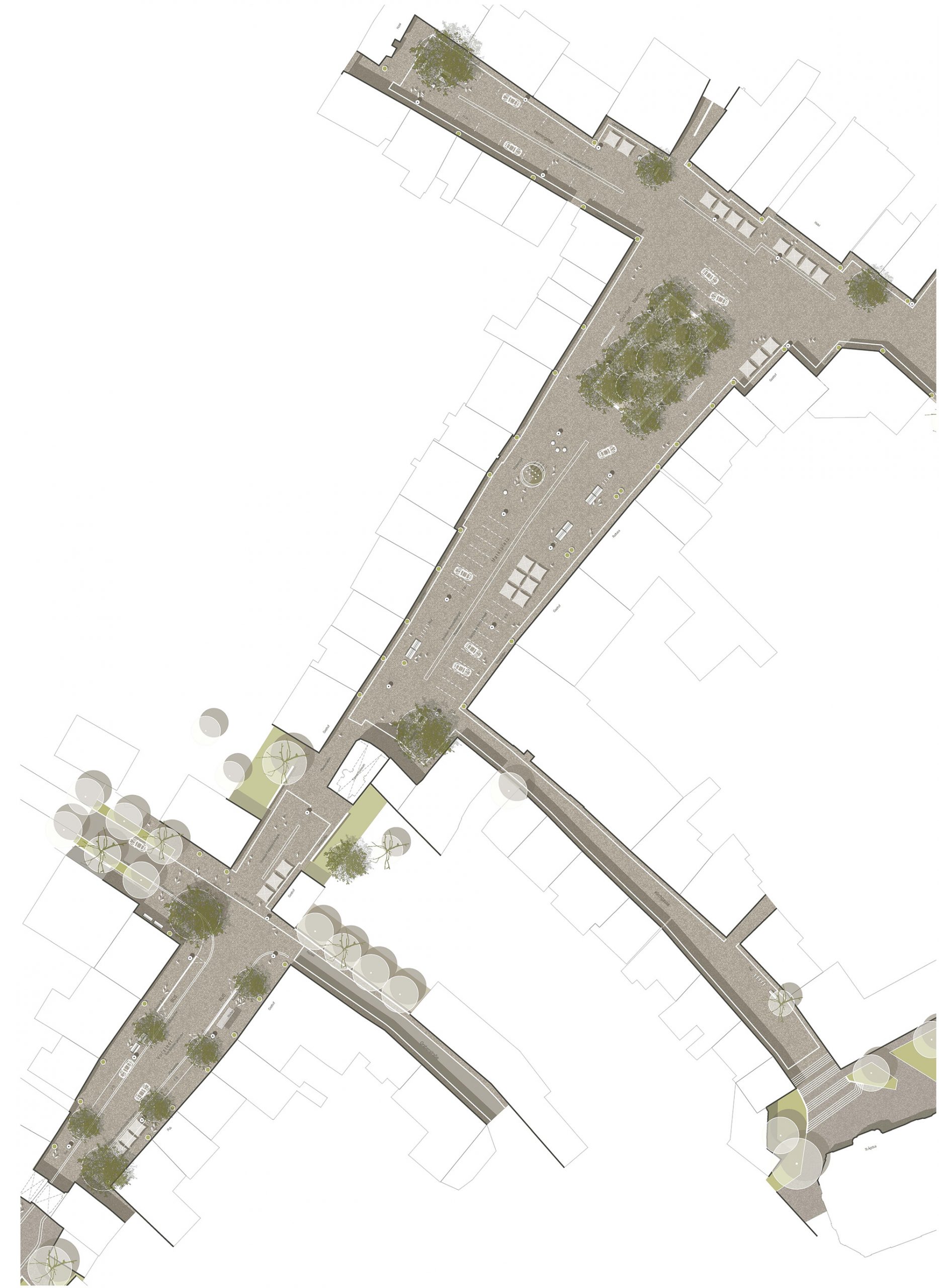 Der Stadtraum ist konsequent fußgängerorientiert, feste Einbauten sind auf ein Minimum reduziert und ermöglichen individuelle Aneignung und gemeinschaftliche Nutzung. Ein hochwertiger, durchgängiger Stadtboden verbindet die Platzräume. Bäume gliedern Übergänge, eine Baumhalle mit Sitzgelegenheiten schafft Aufenthaltsqualität. Wasser, mobiles Grün und Fassadenbegrünung beleben den Raum. Demontierbare Ausstattung sichert flexible Nutzung bis hin zu Großveranstaltungen.
