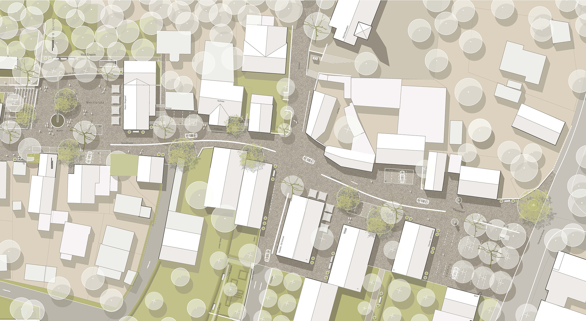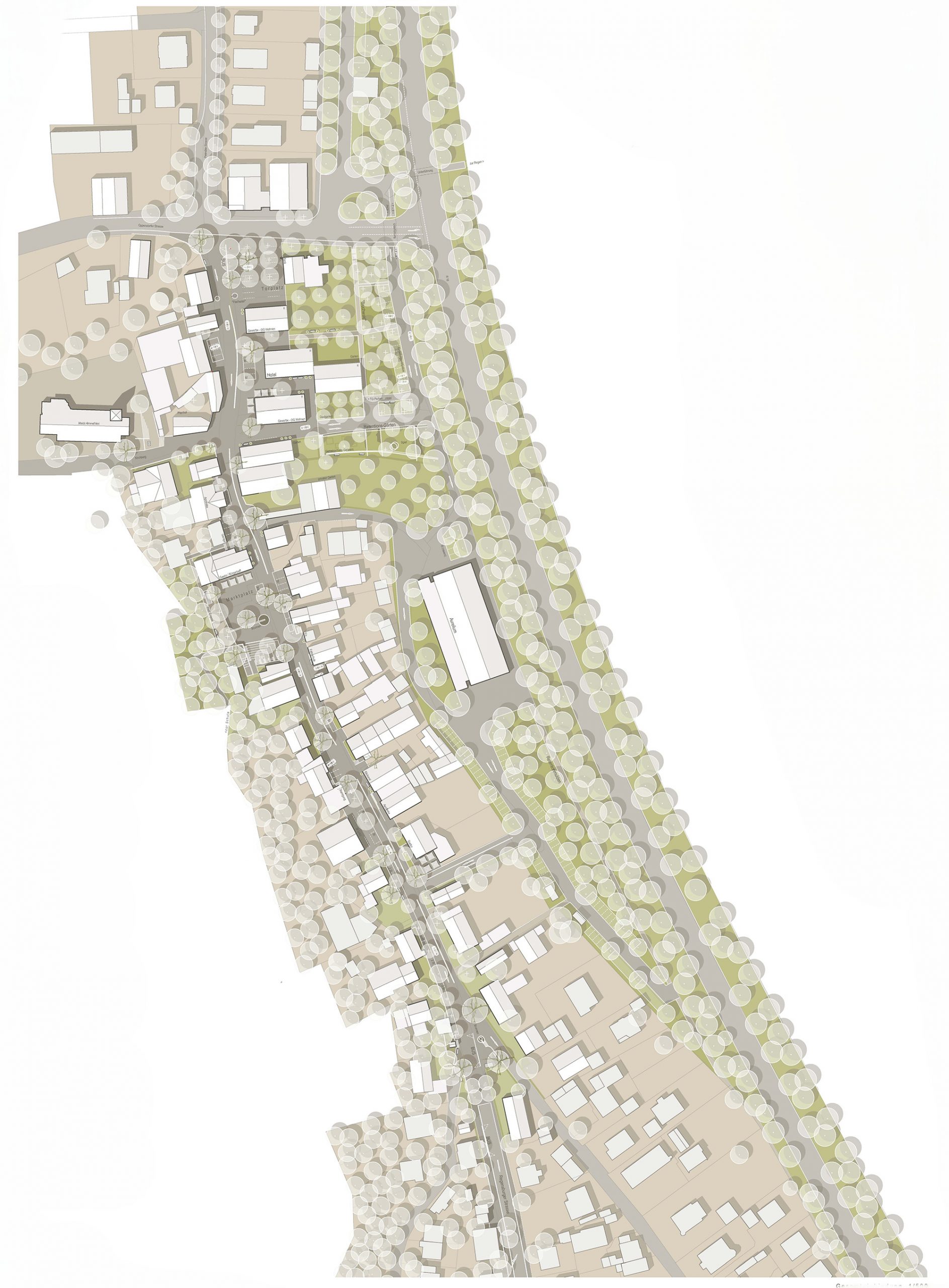 Die städtebauliche Arrondierung folgt der Topografie mit hangseitig traufständigen Baukörpern und talseitigen Setzungen zum Auwald. Neue Gebäude respektieren die Körnigkeit, Stellplätze werden topografisch integriert. Der Marktplatz wird durch Rückbau und Umnutzung zum Bürger- und Begegnungszentrum gestärkt und durch Terrassengärten ergänzt; der Auwald dient zugleich als landschaftlicher Parkplatz- und Retentionsraum.