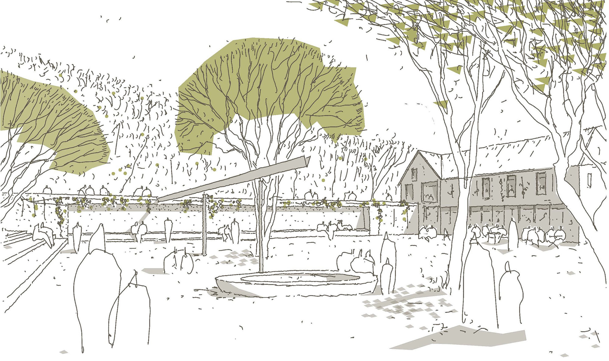 Aus dem Bestand denken ist Leitmotiv des Konzepts. Die vorhandene städtebauliche Grammatik wird aufgegriffen und behutsam weiterentwickelt. Neubauten fügen sich selbstverständlich ein, das bestehende Verkehrskonzept wird im Stadtboden lesbar gemacht, prägende Brunnen und Kunstwerke bleiben identitätsstiftend inszeniert. Klimaanpassung, Barrierefreiheit, Flexibilität und Aufenthaltsqualität sind integraler Bestandteil.