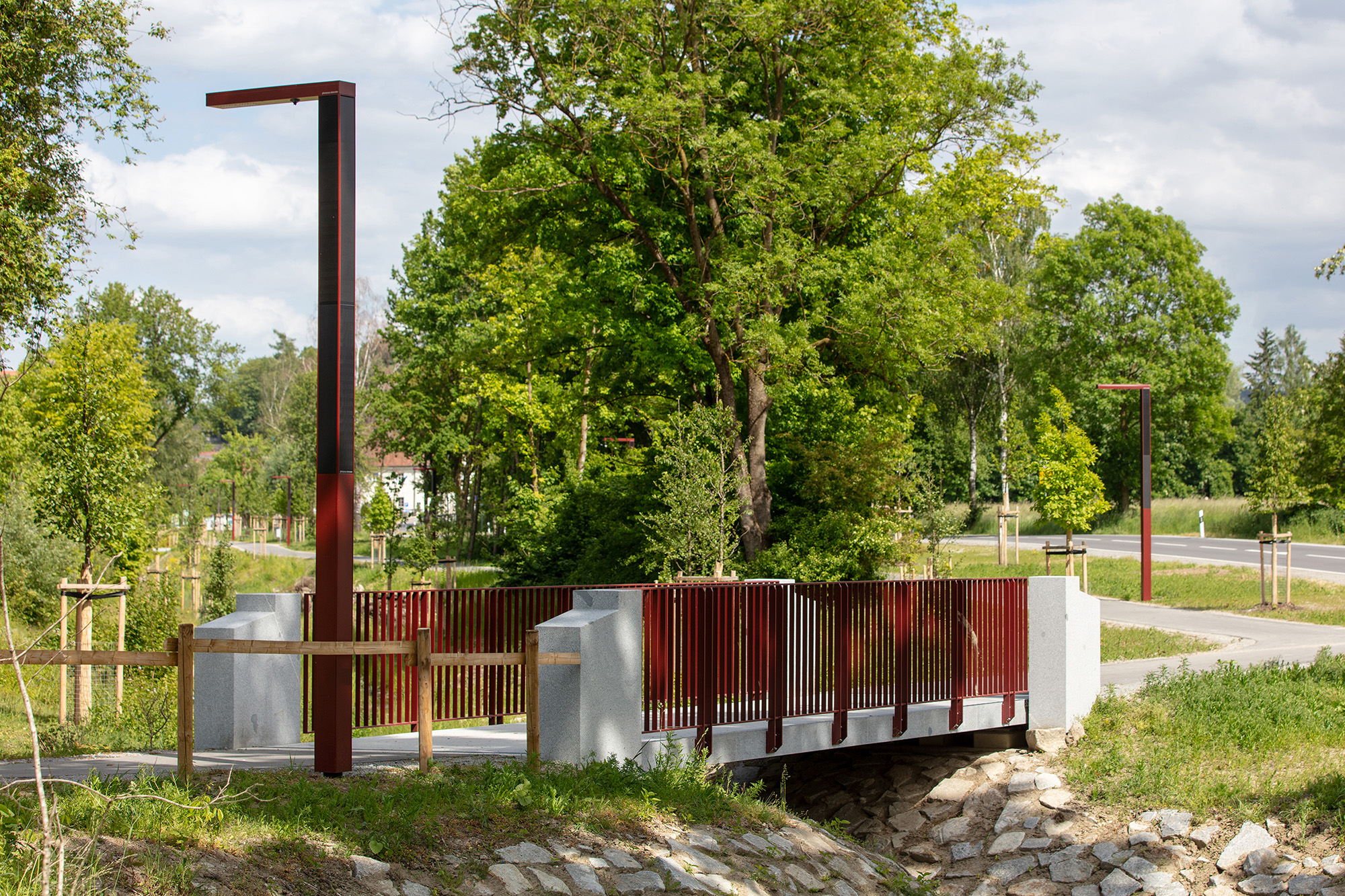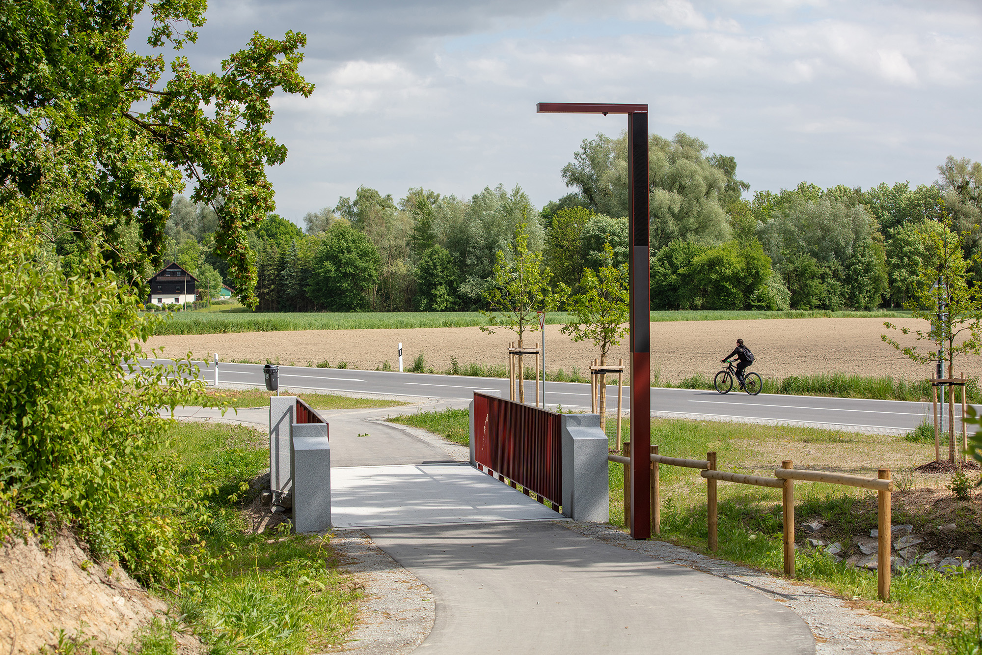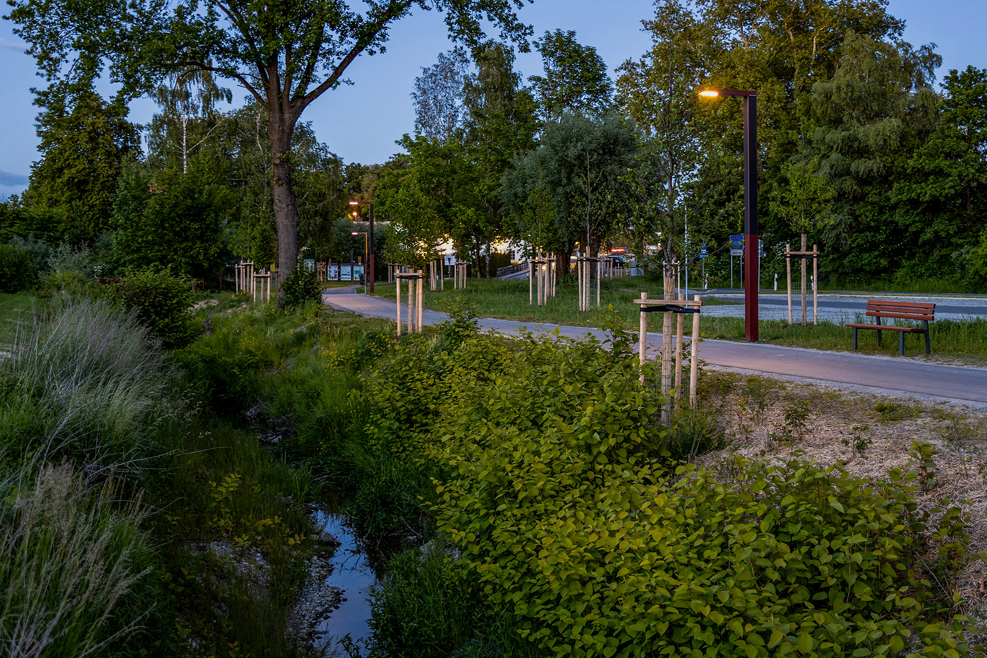 Zentrales Element ist die Renaturierung des Ehebachs: Das Profil wird geweitet, ökologisch differenziert und frühzeitig in den Inn eingeleitet, wodurch neue Biotopstrukturen entstehen und bestehende Gehölze weitgehend erhalten bleiben. Entlang des Bachlaufs führt ein neuer Fuß- und Radweg, der den Ort mit dem Innraum und Richtung Schärding vernetzt. Die Parkierung wird neu geordnet und aus den landschaftlichen Kernbereichen herausgelöst. Eine bereits installierte, zurückhaltende Beleuchtung begleitet den Weg und stärkt Sicherheit, Orientierung und Aufenthaltsqualität.