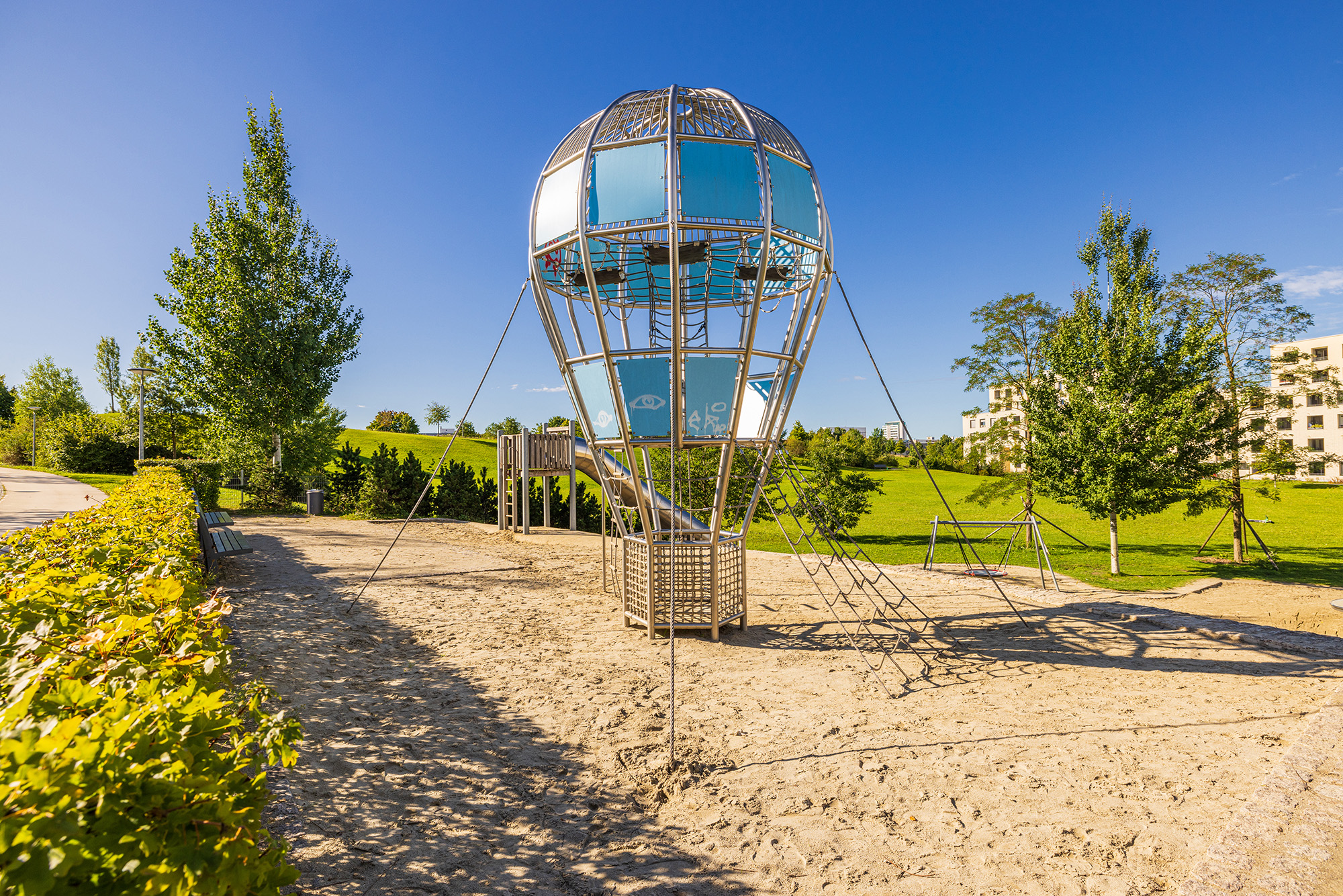 Die Geländemodellierung entlang der Bahnlinien schafft lärmgeschützte Freiräume, abwechslungsreiche Spazierwege und – trotz der relativ langgestreckten Grünfläche – angenehm proportionierte Aufenthaltsräume für Spiel- und Treffpunkte.