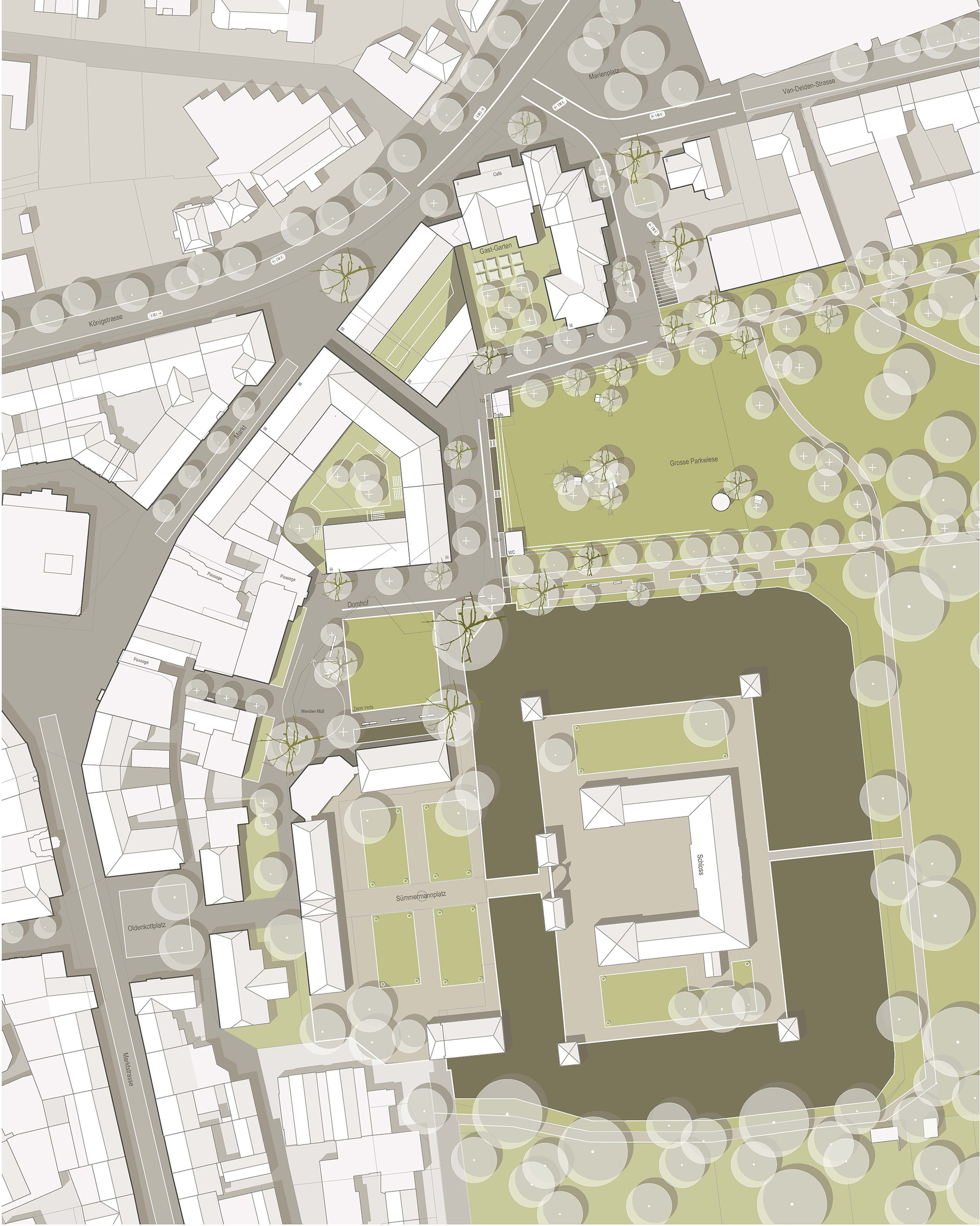 Der bislang rückwärtig geprägte Stadtraum wird durch Nachverdichtung mit Wohnen und Gewerbe sowie durch neue raumbildende Baukörper entlang einer differenzierten Platzfolge neu gefasst. Zwei allseitig orientierte Blöcke nehmen markante Baufluchten auf und entwickeln im Dialog mit der Geometrie des Schlossparks eine Abfolge zum Grünraum hin geöffneter Plätze und Promenaden. Erdgeschosse mit erhöhter Raumhöhe ermöglichen flexible Nutzungen, darüber entstehen vielfältige Wohnformen mit grünen Innenhöfen.